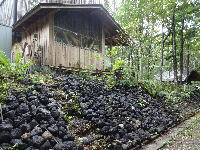 体力から2台分を目途に、そして囲炉裏小屋へのアプローチの斜路の側面も同じ溶岩で表現するそのことで一面で