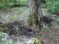 区切りの線引きを板で弧を描くように打ち込みましたが根が張ってうまく入らないので腐葉土つくりの為に開けた穴