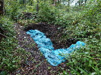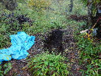| 170506 二つに分かれていた穴、途中の壁撤去して一つの穴にする、交代での腐葉土の作成より一回に双方使う可能性が高い、穴の中での作業が一つだとしにくいので。出た土は腐葉土の上に撒く。 |