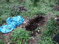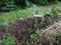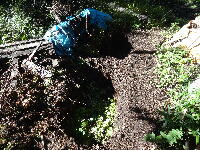 | 170603 腐葉の葉がなかなか土にならないので新たな穴を掘ってその土をこれまでの腐葉の葉の上に散布することとしたこれで溜まっていた葉も新の穴に入れ、これまでの穴は普通の場所のようになったこれで秋に掘り起こすことにする。 |