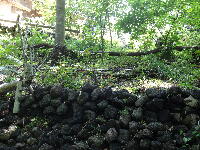 | 180915 昨年の落ち葉がほぼ1年(11月中旬の落ち葉)で土として各所に供給。今年の落ち葉の収納場所として開けておく必要もあるので、このサイクルで利用できる事分かりました。石垣際や斜面、畑地に利用する。下方には水が届かず腐葉土化していないこともある事判明。なかなか落ち葉の撹拌は出来ないので工夫が必要だ。 |